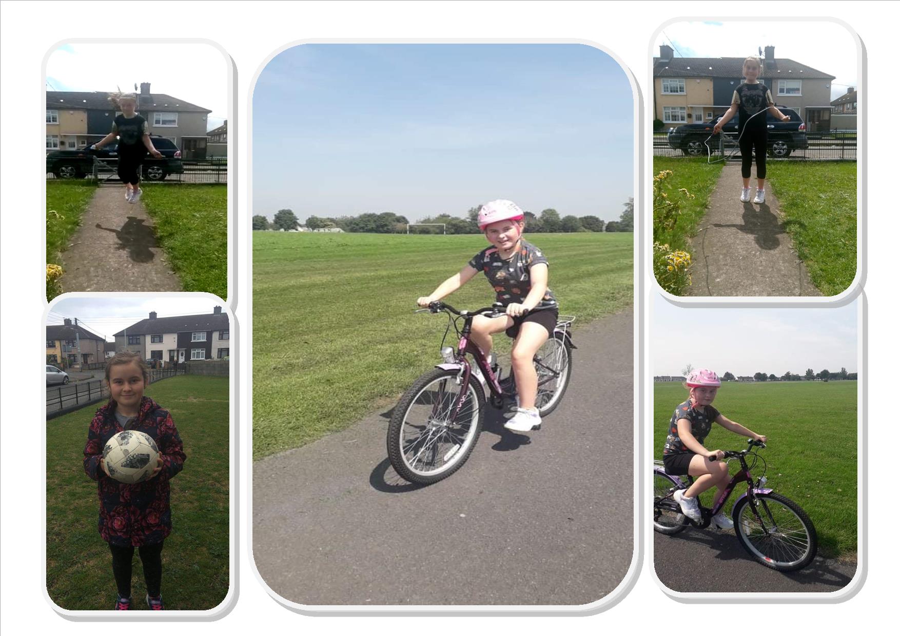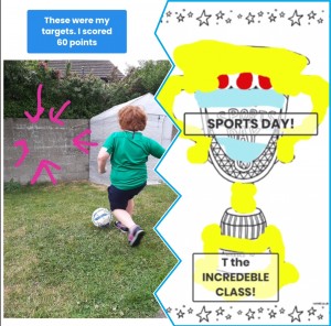 Some amazing sporting activities took place this week from football, basketball, rock-paper-scissors tag, scooting, cycling, hula hooping, skipping, running, egg and spoon race, art work, Irish reading and writing, maths activities, reading sport related stories, creating mascots and many more.
