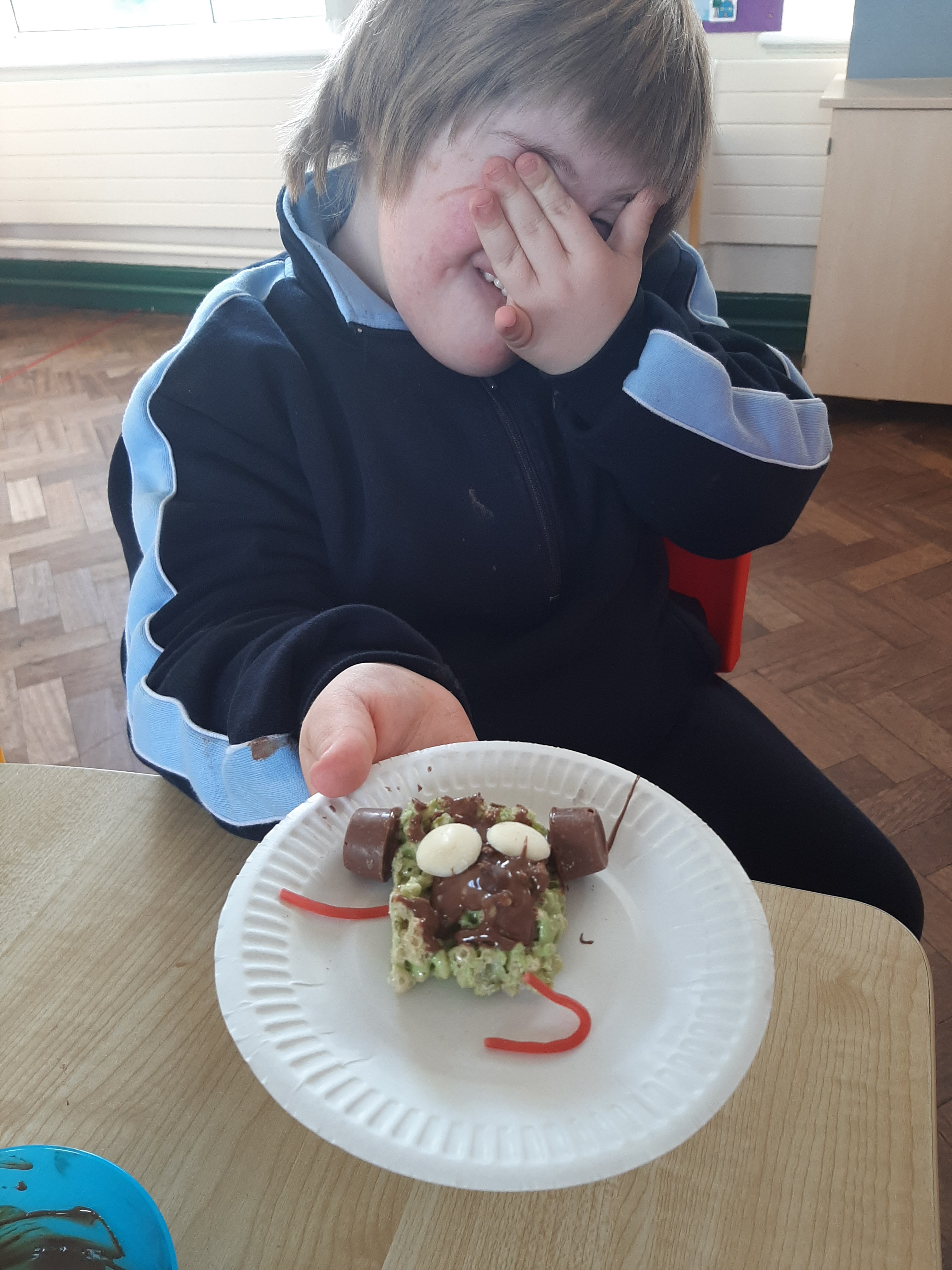 To get in the mood for Hallowe’en we made Frankenstein treats. We used rice krispies, marshmallows, green food dye, chocolate, rolos, strawberry laces and white buttons. They were more tasty than scary!