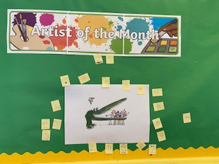 This month’s Artist of the Month in Mr Smyth’s Class is Quentin Blake. The children have been looking at his work in his first collaboration with Roald Dahl in 1978, The Enormous Crocodile. The children have been discussing their feelings about a piece of his work and they have been sticking up little notes around the image with words and emojis to express how they feel about it. Today they began drawing their own version of the picture. Come back again soon to see their finished work!