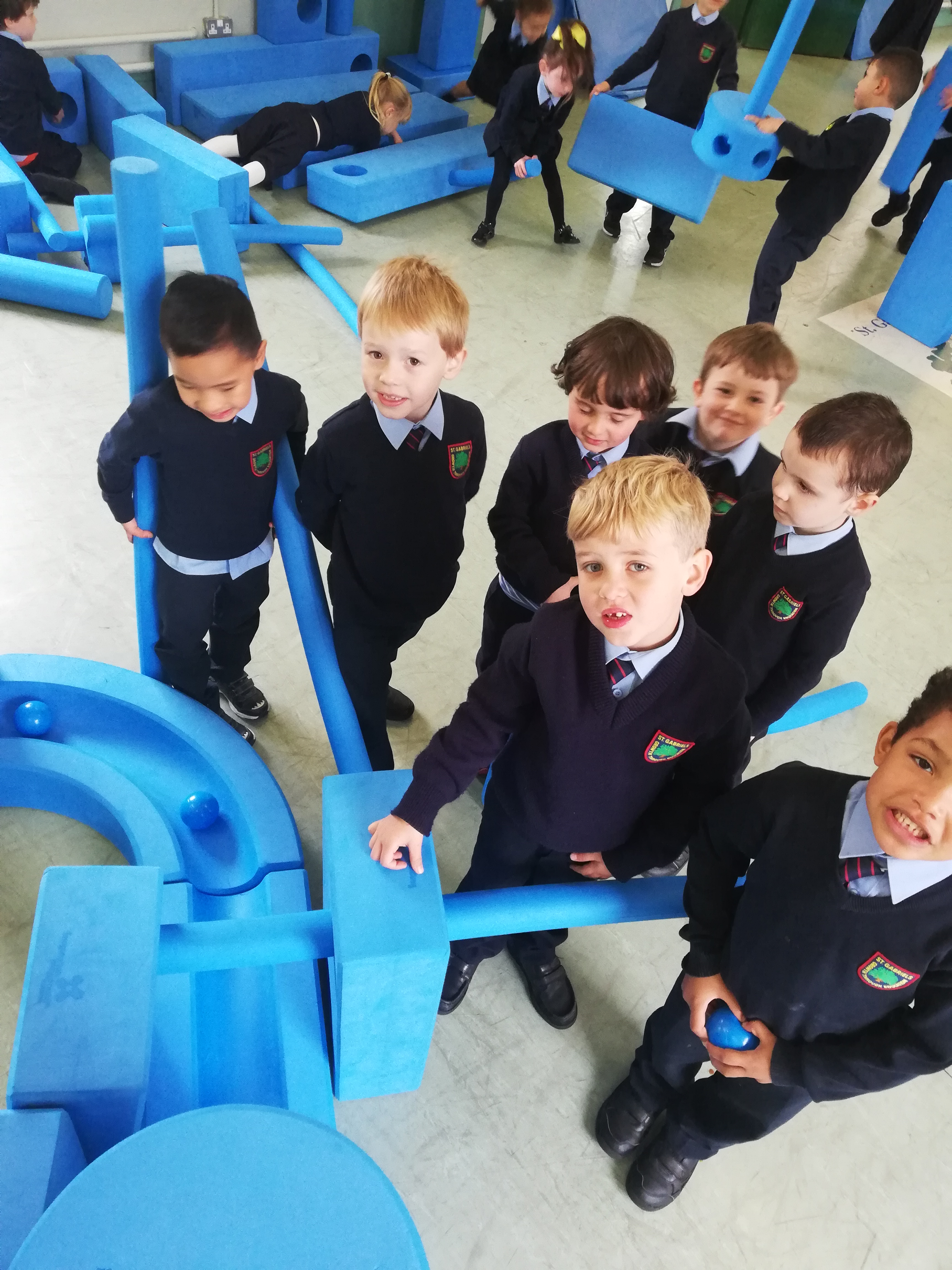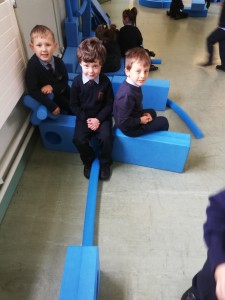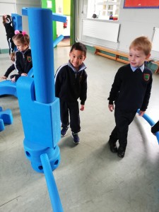 In the photographs you will see some of their fantastic creations. So far Junior Infants have constructed an aeroplane, a factory, a burger shop, seesaws, slides, ball chutes, a variety of houses, robots and rockets! Every day brings new ideas!