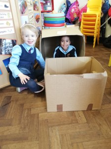 Junior Infants had great fun designing and building their own structures during play. They had the chance to dress up as builders and use some of the tools that a builder uses. The boys and girls enjoyed designing and constructing houses, schools, apartments, hospitals etc out of old cardboard boxes! It was extra fun when the boxes were big enough to fit into!