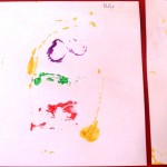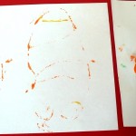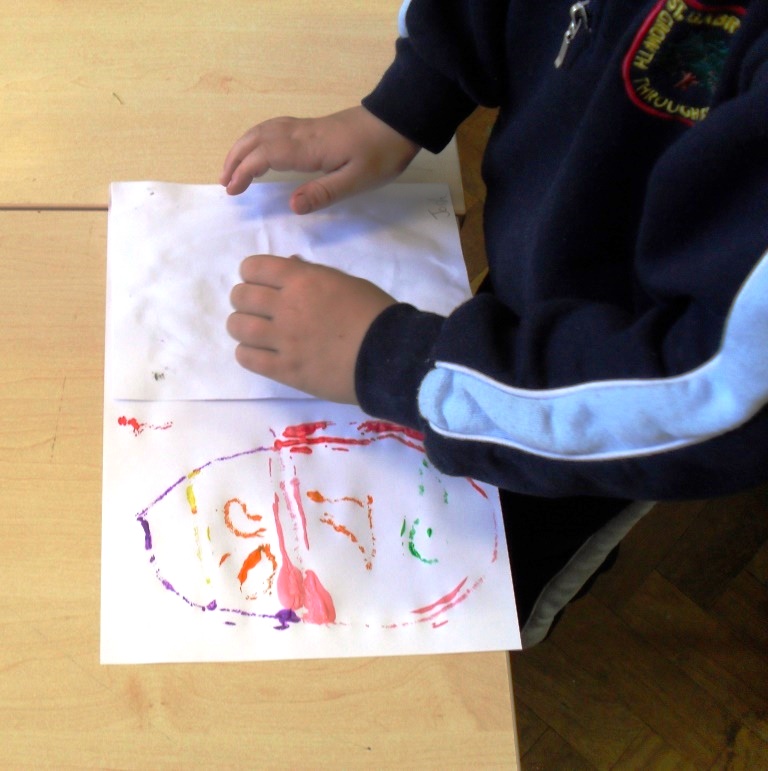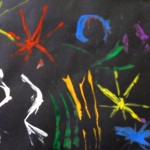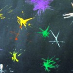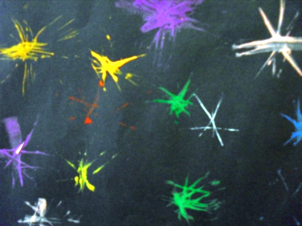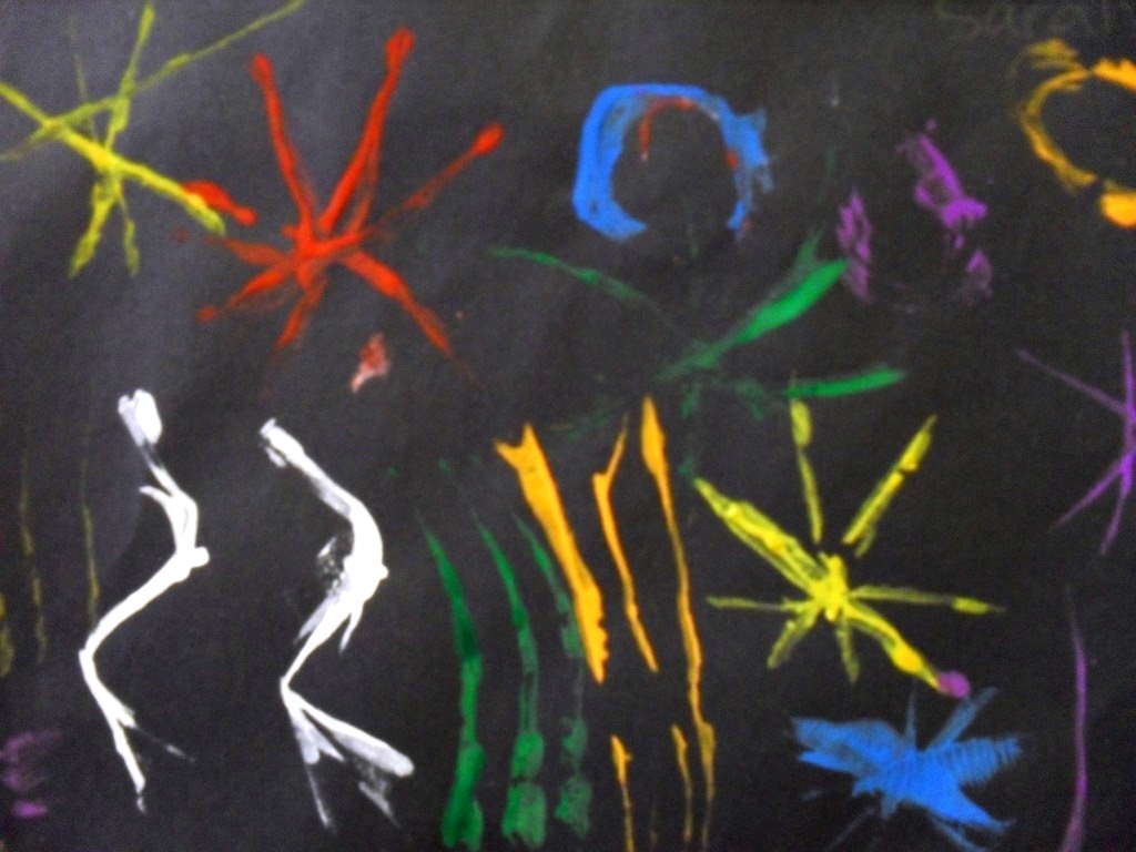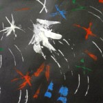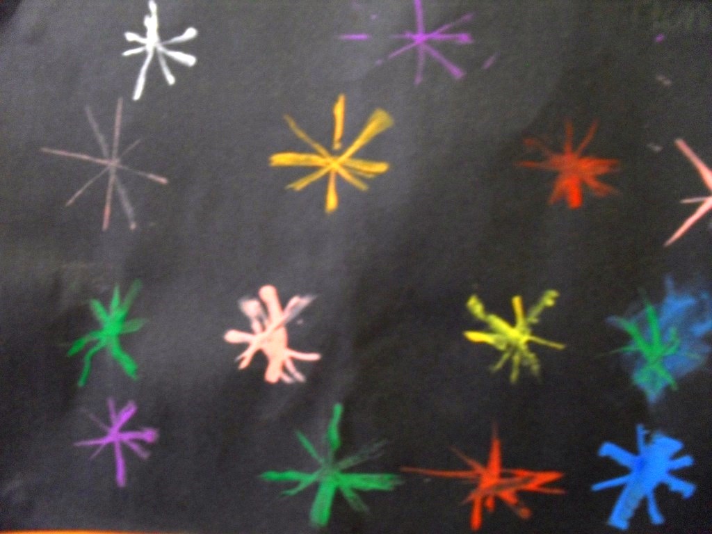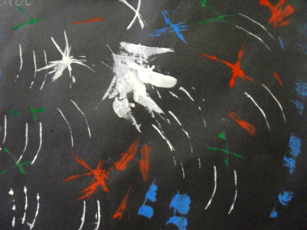 We also printed pictures of fireworks and shooting stars. We used the edge of card dipped in paint to do this.