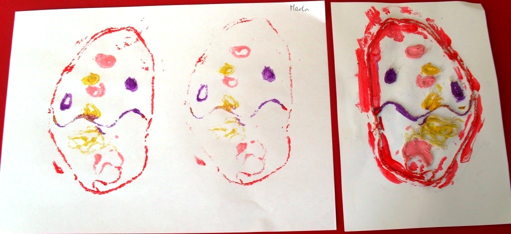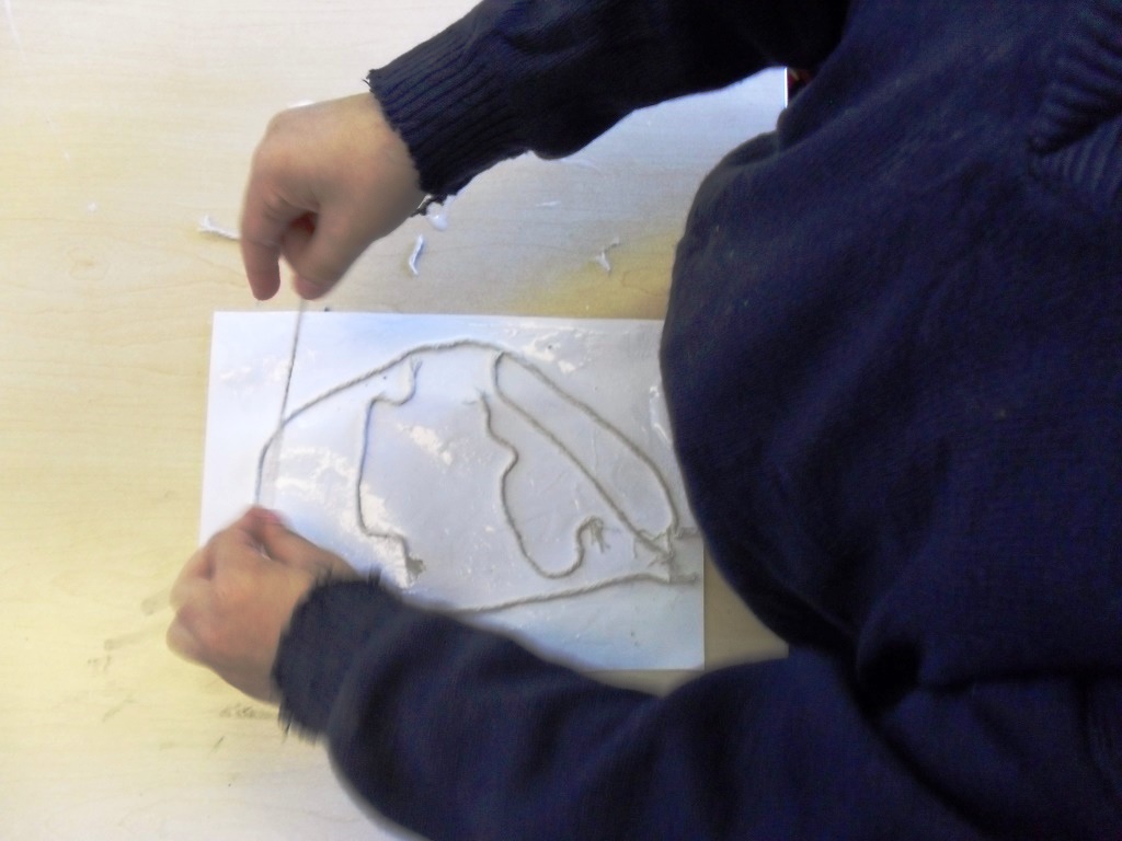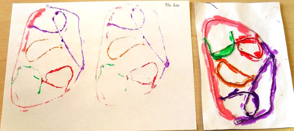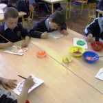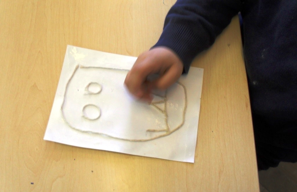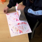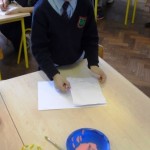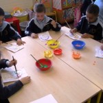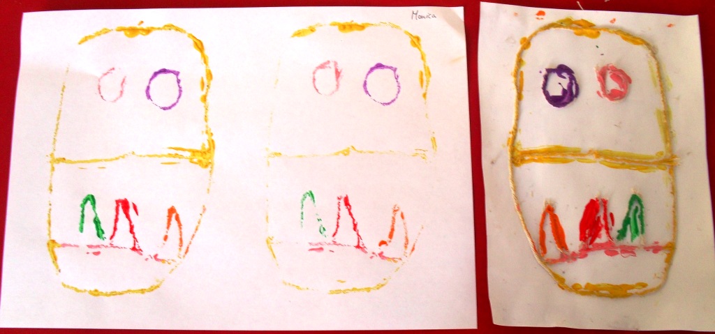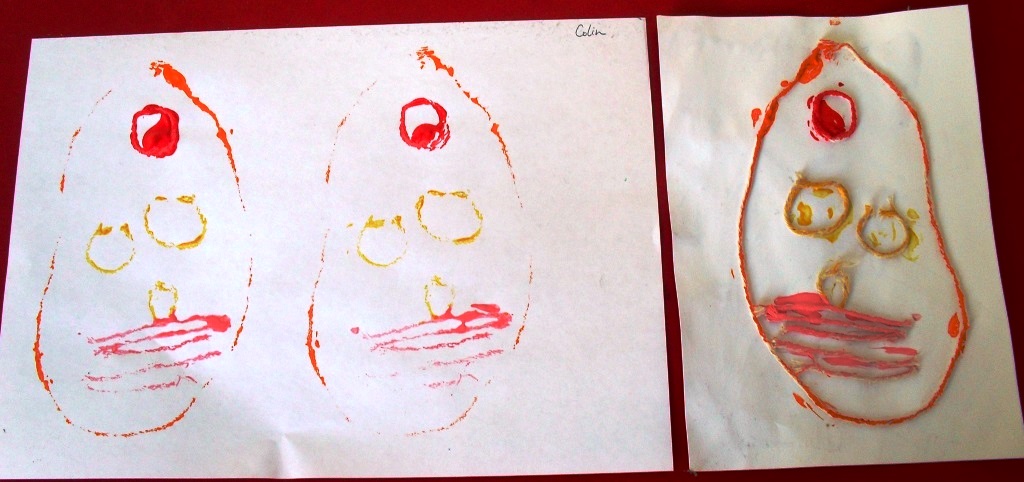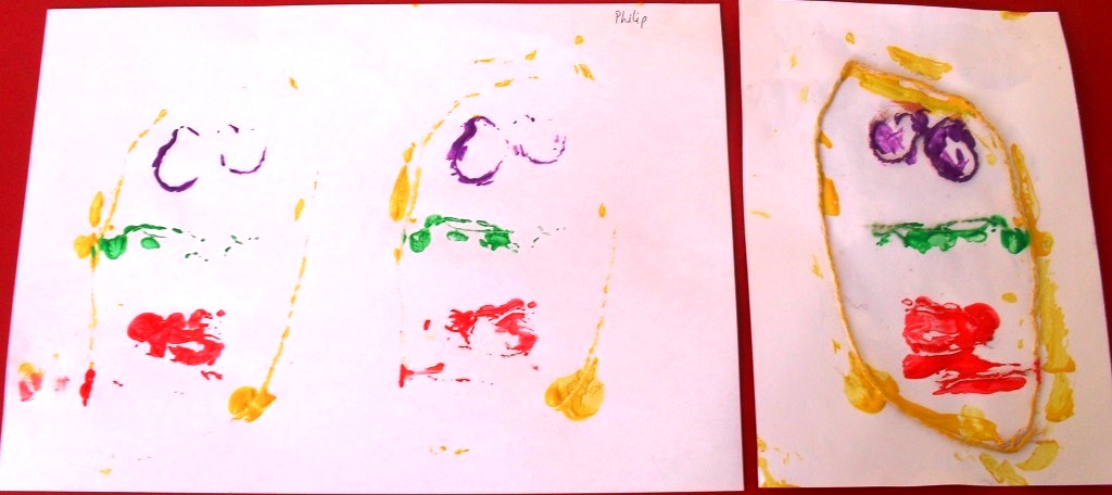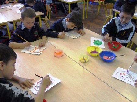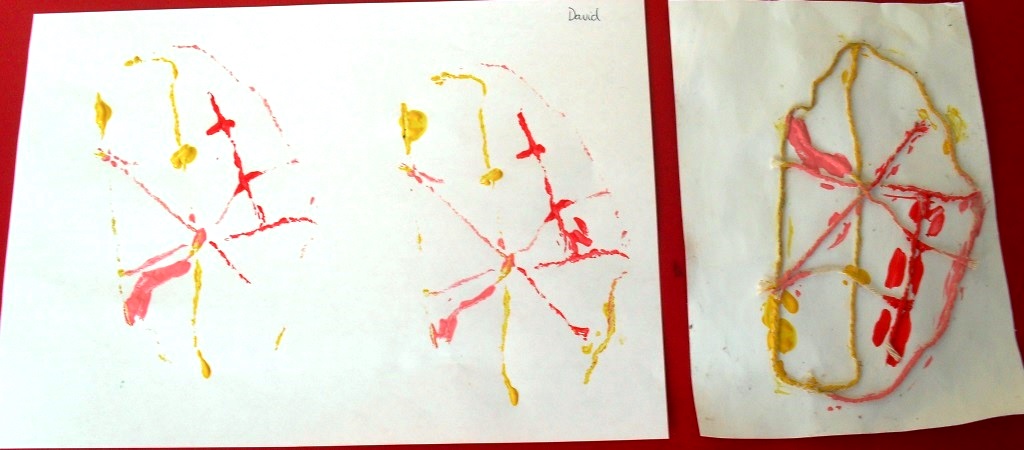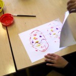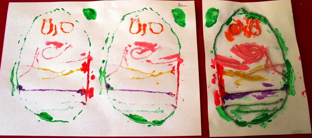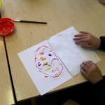 In Senior Infants we made big Easter egg stamps by cutting twine and gluing it onto card in the shapes we wanted. When they dried we painted the stamps and pressed them onto paper to print our eggs!