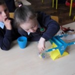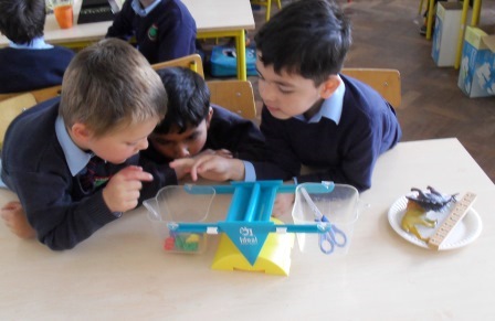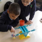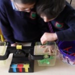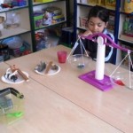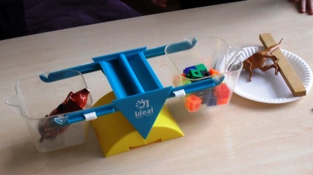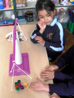 We used different non-standard units such as cubes, beads, teddy bears and animals. Some of the groups found out that a scissors weighs the same as seven cubes and the same as three elephants, a counting stick weighs the same as nine kangaroos and the same as sixteen beads!